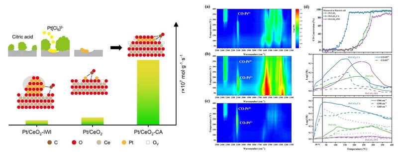 在环境治理和能源利用过程中,一氧化碳(CO)氧化是极为关键的基础反应。然而,在低温条件下实现高效且稳定的 CO 转化一直是贵金属催化剂研究的难点。本研究创新性发展了柠檬酸辅助静电吸附(CA-SEA)策略,通过调控贵金属前驱体与柠檬酸分子的竞争吸附,在 CeO2 载体表面成功构筑出结构均一、二维“筏状”结构 PtOx,其独特结构显著改善了PtOx电子性质,使得PtOx筏上CO吸附性能显著优于Pt 单原子或 PtOx团簇结构,随后吸附CO与PtOx筏和CeO2表面的O*物种反应,使得PtOx筏状催化剂的T50(50%CO转化温度)比Pt单原子和PtOx团簇的催化剂降低120°C以上,表现出极其优异的CO低温氧化活性和稳定性。